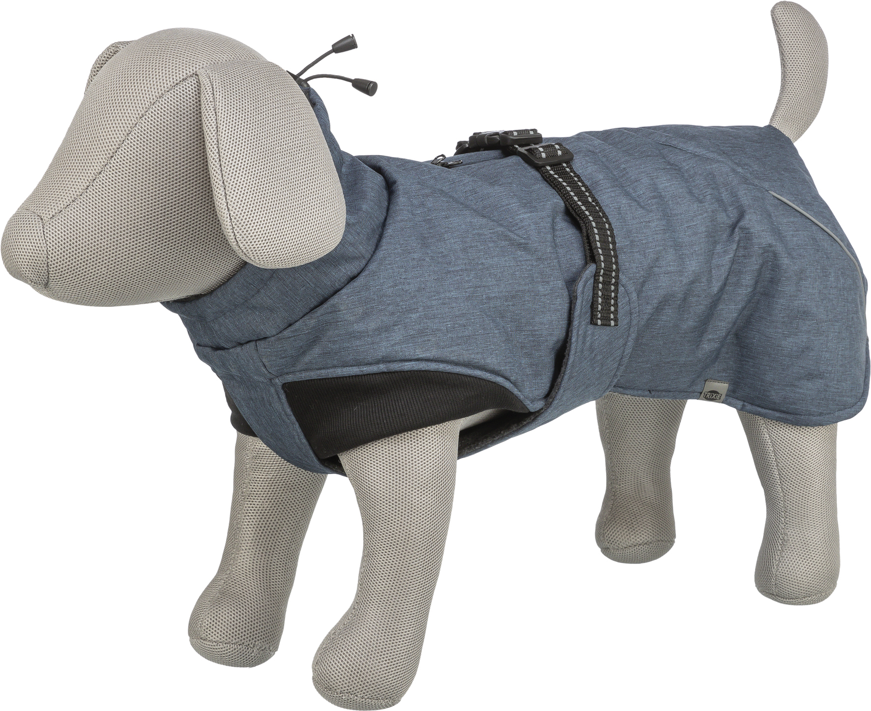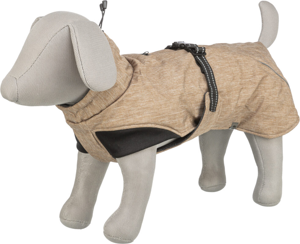 polyester vand- og vindtæt men stadig åndbar med blødt plysfor og polstring (polyester) svejsede sømme og vandtæt lynlås 3M™ refleksstriber kan kombineres med sele elastiske elementer i hals- og skulderområdet med løbegange maverem med spænde, trinløs justerbar justerbare løkker til bagbenene forenelig med dyrevelfærd i forhold til § 18 (AT)