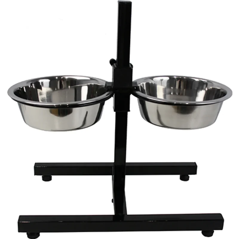 Madbar til foder og vand, 2 stk. rustfri stålskål, justerbar stativ i sortlakeret metal.